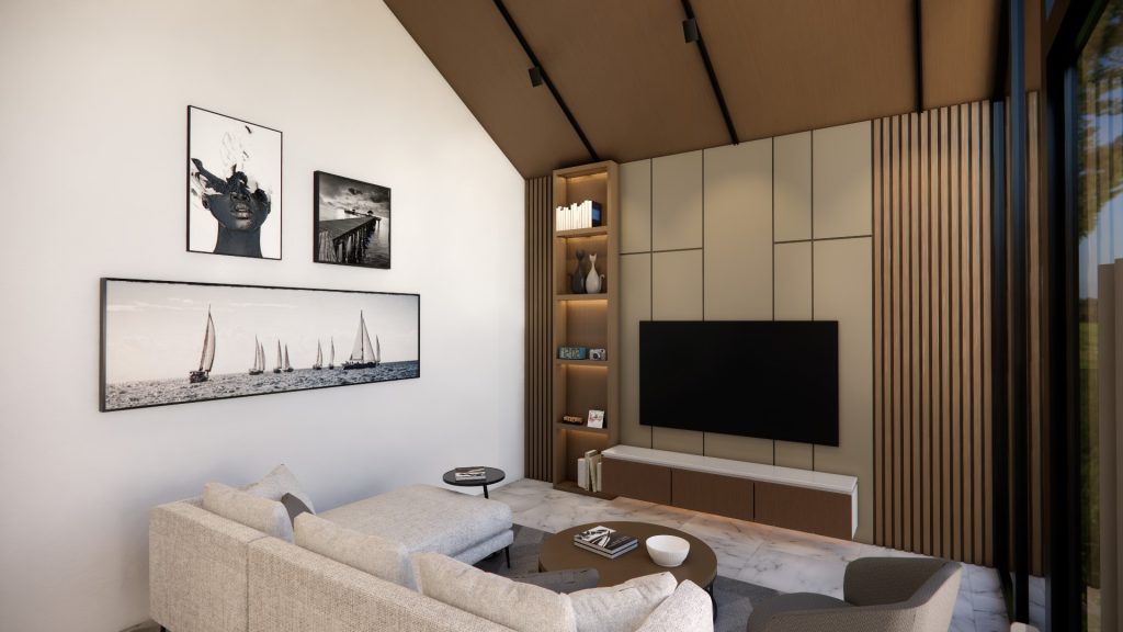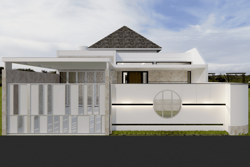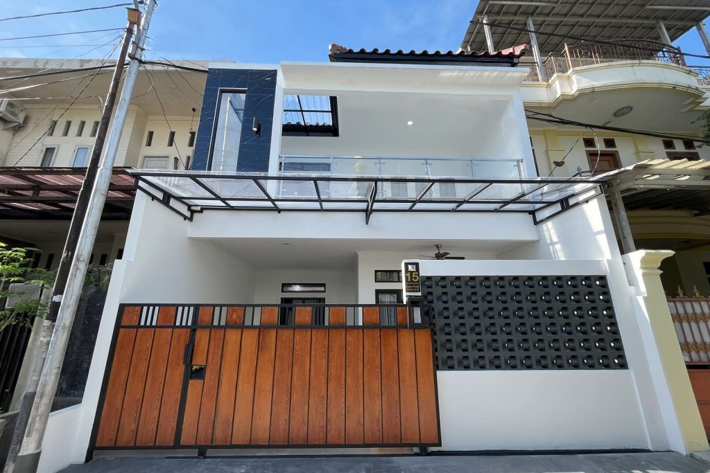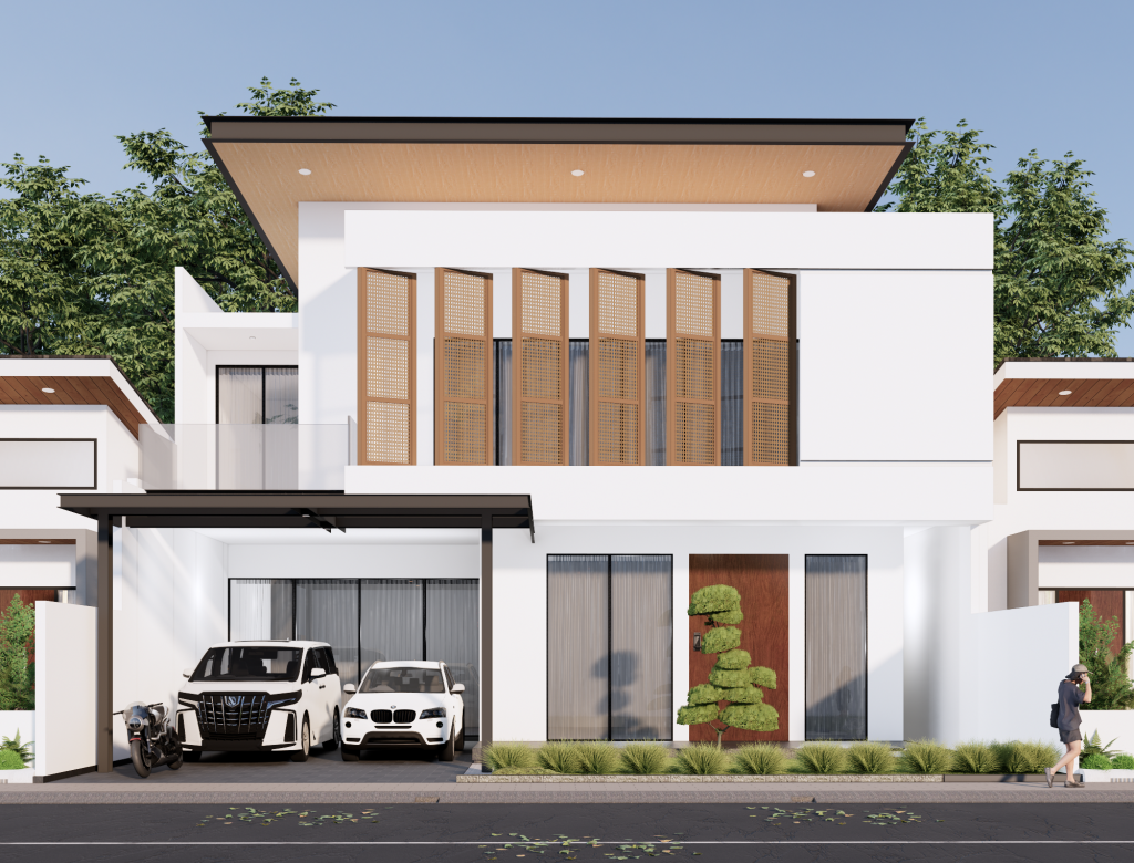 Rumah bergaya kontemporer dengan tampilan simpel tapi elegan. Warna putih dipadu aksen kayu bikin fasadnya hangat dan modern. Jendela besar ber-kisi jadi pemanis sekaligus bikin cahaya alami masuk lebih lega. Ditambah atap datar dan taman kecil di depan, membuat tampilan menjadi lebih segar dan stylish.